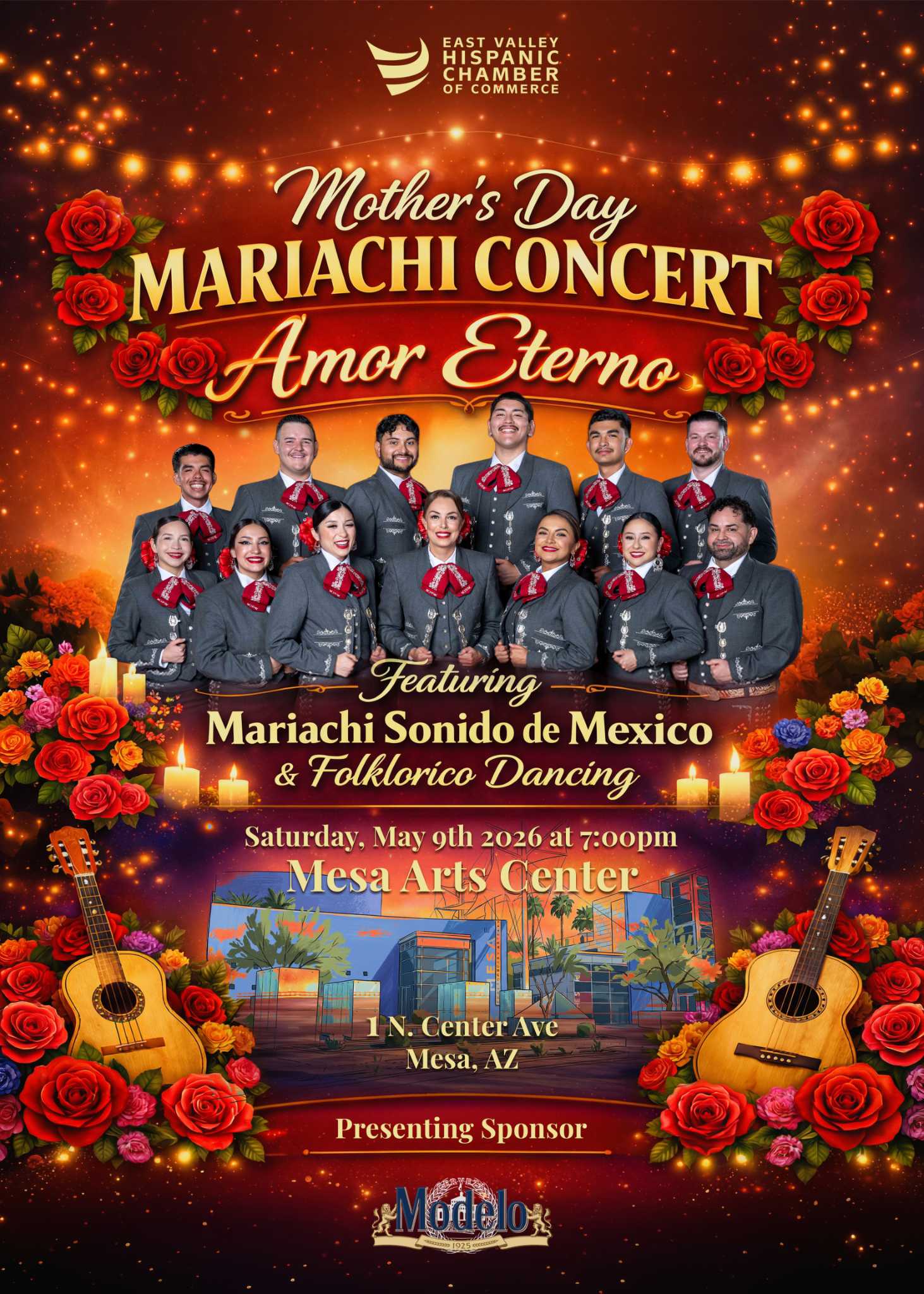 The East Valley Hispanic Chamber of Commerce proudly presents Amor Eterno, a premier Mother’s Day Mariachi Concert. Join us for a vibrant celebration featuring the world-class sounds of Mariachi Sonido de Mexico and breathtaking Folklorico Dancing.